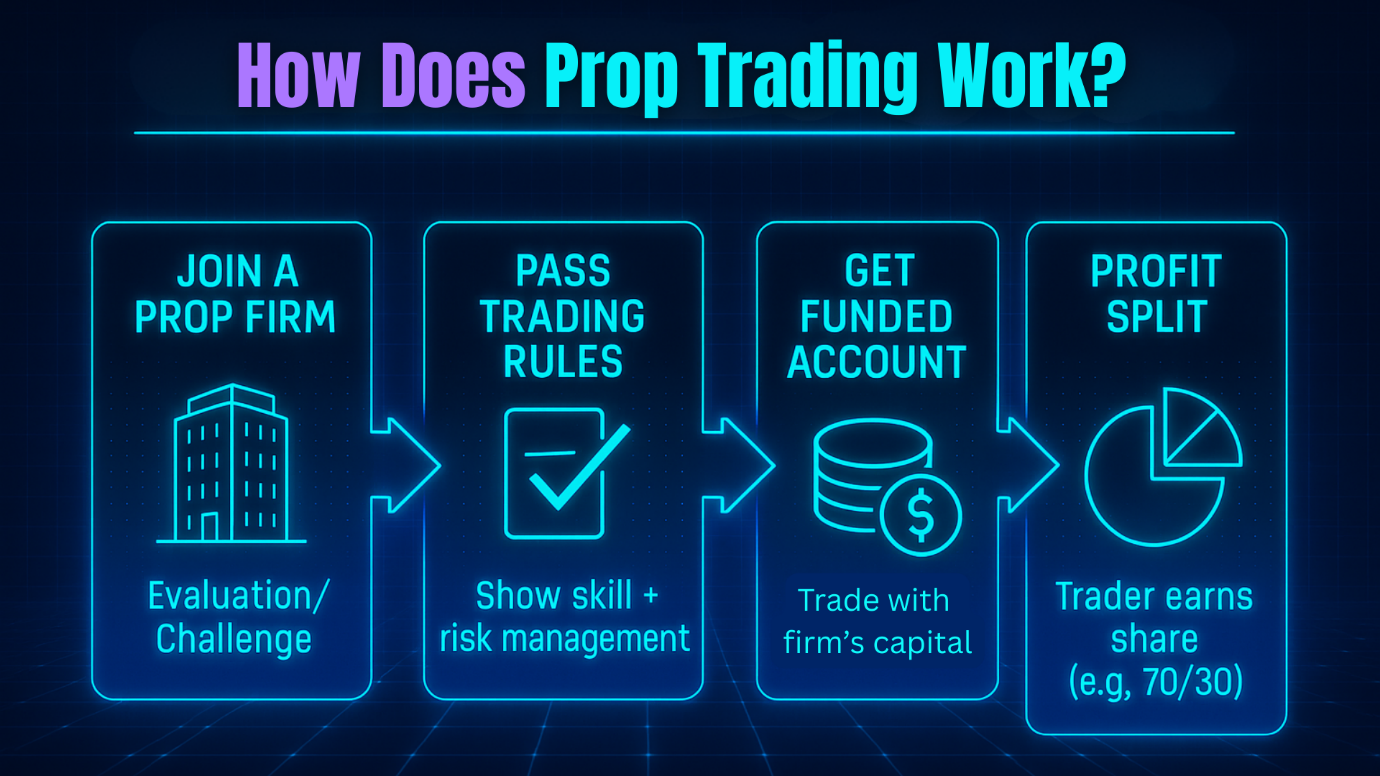 Prop trading (short for proprietary trading) is when traders use a firm's capital to place trades, rather than their own money. In return, profits are shared between the trader and the firm—usually with the trader keeping 70–90%.